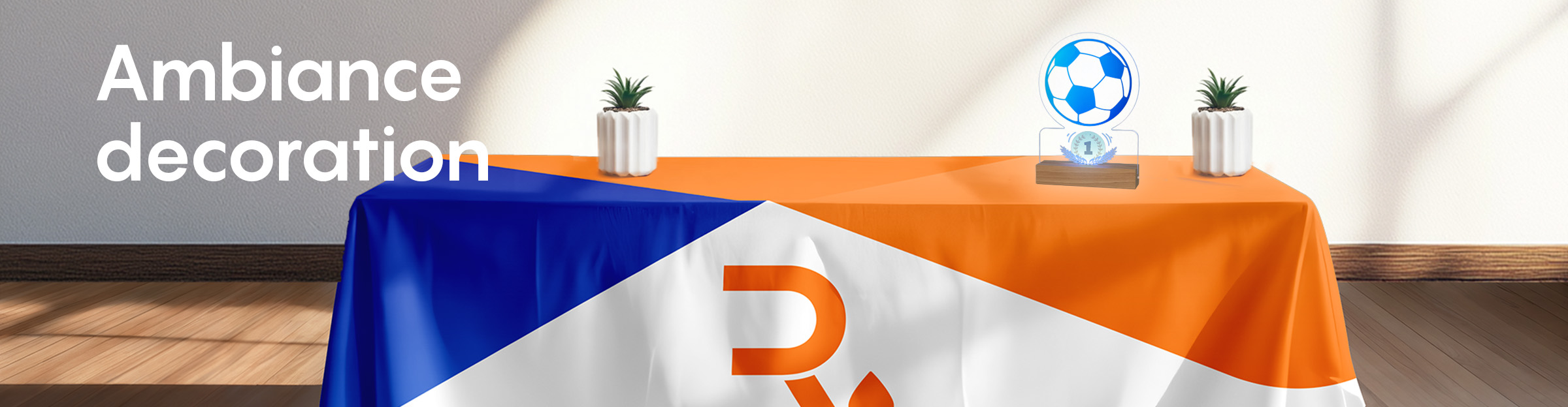 Pour permettre d'instaurer l'ambiance de votre choix, nous vous proposons la personnalisation de 3 supports : la chaise longue, la nappe publicitaire et les lettres 3D. La chaise longue, ou transat, est idéale pour créer une toute nouvelle ambiance détendue, cool et fun. Sa toile personnalisable permet de créer un support aux couleurs de l'entreprise afin de la représenter. Pour un usage intérieur ou extérieur, le transat saura plaire à votre client par son confort et son atout publicitaire. Dans un second temps, Realisaprint.com propose la nappe publicitaire. Déclinée en 4 formes (rectangulaire, ronde, ajustée et le chemin de table), la nappe est un excellent moyen de créer l'ambiance de son choix en choisissant les visuels et couleurs adéquates en fonction des besoins. Ainsi, il devient facile d'instaurer une ambiance moderne, rétro, contemporaine, vintage et bien d'autres types d'ambiance. Enfin, nous proposons les lettres 3D. Ce support apporte une touche élégante à la décoration des locaux de l'entreprise. Il permet d'écrire le mot de votre choix et ainsi d'apporter du dynamisme, du relief et un côté fun à la décoration. Les lettres 3D font preuve de fiabilité puisque, peu importe le choix de la matière que votre client fera, ces lettres sont garanties entre 7 et 10ans.