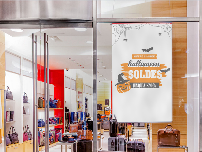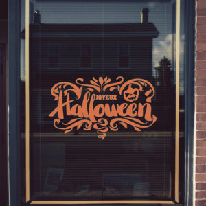 Le mois d’octobre est connu pour sa fête populaire : Halloween. Pour sortir du lot, on vous propose de transformer les vitrines de vos clients en un tableau maléfique. Avec le visuel suspendu, l’autocollant ou les lettres adhésives, les fantômes n’ont qu’à bien se tenir.