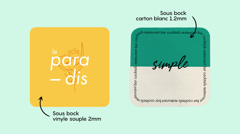 Enfin, le rond de bière est un support souvent imprimé en recto uniquement, puisque l’on ne peut voir qu’une face à la fois. Cependant, nous offrons la possibilité de personnaliser en recto et en recto/verso. Le recto/verso est idéal pour un support réutilisable, à retourner. Vous pouvez également jouer avec les faces imprimées en inscrivant « Offre promotionnelle à retrouver au dos ».