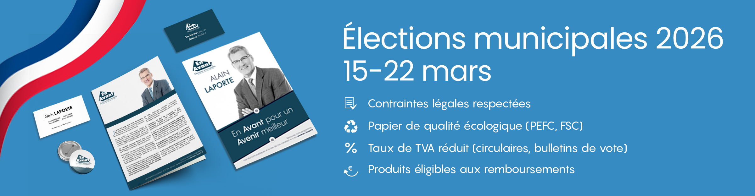 Les frais d'impression des bulletins de vote peuvent être remboursés par l'État. Les candidats peuvent avoir ce remboursement si un nombre de bulletins de vote est égal au double du nombre d'électeurs, majoré de 10%. De plus, pour avoir accès à ce remboursement, les bulletins de vote doivent respecter quelques obligations légales. En effet, le papier doit contenir au moins 50% de fibres recyclées ou bénéficier d'une certification internationale de gestion durable des forêts. Ainsi, pour l'impression des bulletins de vote de vos clients, nous proposons une impression sur un papier PEFC et FSC. De plus, les bulletins de vote ne peuvent pas comporter d’autres noms de personne que celui du ou des candidats ou de leurs remplaçants éventuels.