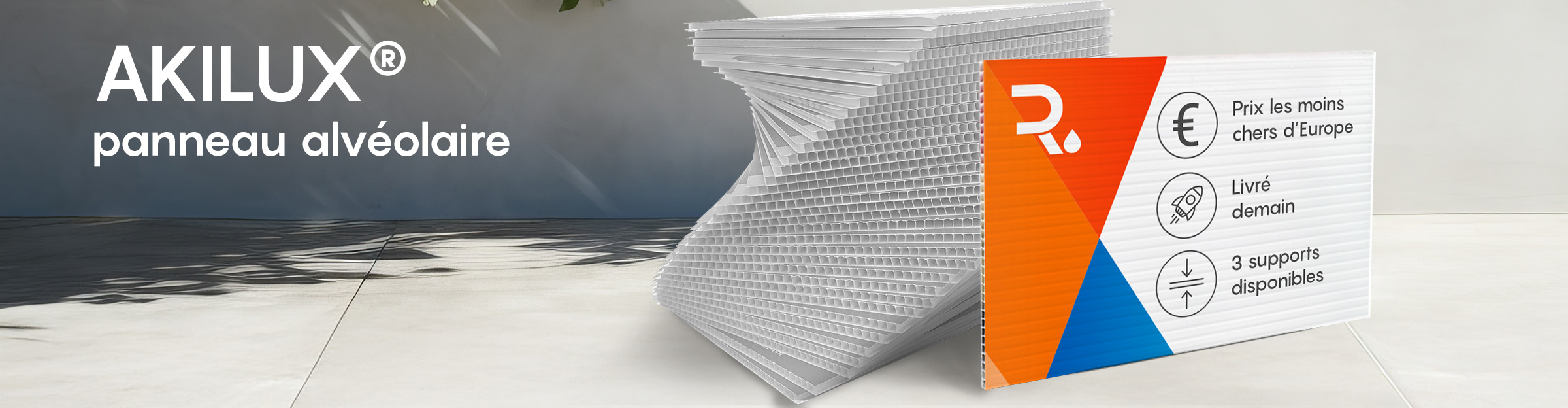 Le panneau Akilux® est un panneau imprimé sur un support en polypropylène alvéolaire, qui est largement utilisé par les professionnels de l'immobilier, du bâtiment ou encore des artistes. Ce support de communication est hautement résistant aux intempéries telles que la pluie, le vent, le soleil, ainsi qu'aux rayons UV, ce qui garantit une durée de vie prolongée au panneau. En ce qui concerne la réalisation graphique du support, elle est primordiale car la plaque va se trouver dans des endroits très fréquentées et à la vue de tous. Pour cela, vos clients auront le choix d’opter entre une orientation portrait ou paysage de leur panneau alvéolaire. Vous avez également la possibilité de leur proposer différents formats prédéfinis, ainsi qu'une option de découpe sur mesure à un prix abordable en impression recto ou recto/verso. Enfin, d’autres options sont présentes pour que vos clients obtiennent un support dynamique et attrayant. Ils auront donc la possibilité de recourir à la pose d’œillets à chaque coin du support, à l’impression avec un vinyle et contrecollage pour augmenter la durée de vie du panneau, et au pli vertical pour bénéficier d’une visibilité maximale, et ce, quelle que soit la position du panneau alvéolaire.